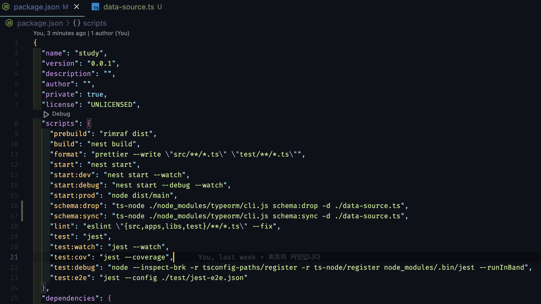 루트폴더(study폴더. 즉, 프로젝트의 최상위 폴더를 루트폴더라고 합니다)에 data-source.ts 파일을 생성합니다.