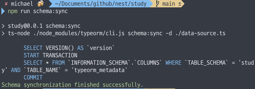 npm run schema:sync 명령어를 터미널에 입력해 보도록 합시다.