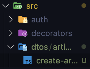 src폴더 안에 dtos폴더를 만들어주고, dtos폴더 안에 article폴더를 또 만들어 줍시다. 그리고 article폴더 안에 create-article.dto.ts 파일을 만들어줍시다.