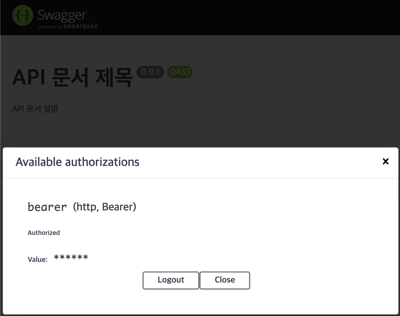 스웨거 문서에 들어가서 다음과 같이 로그인을 하면