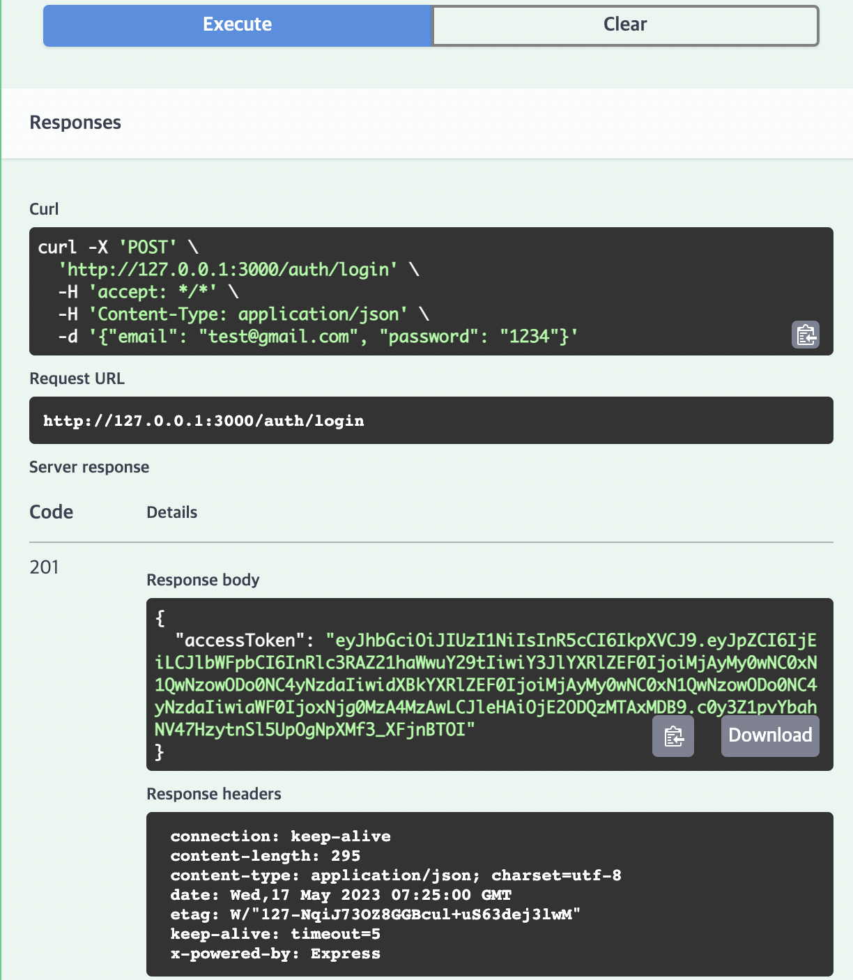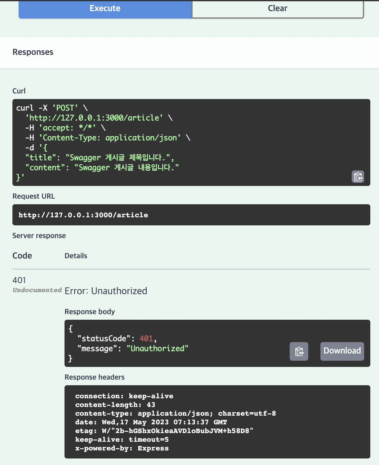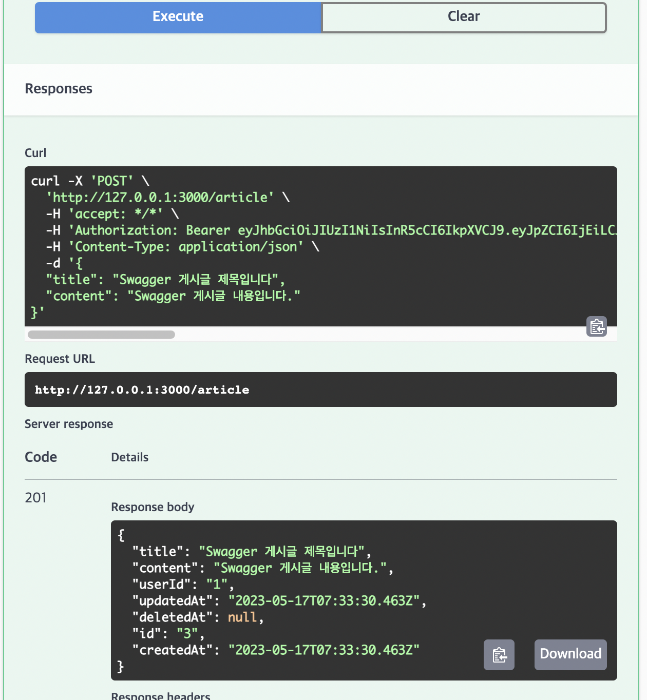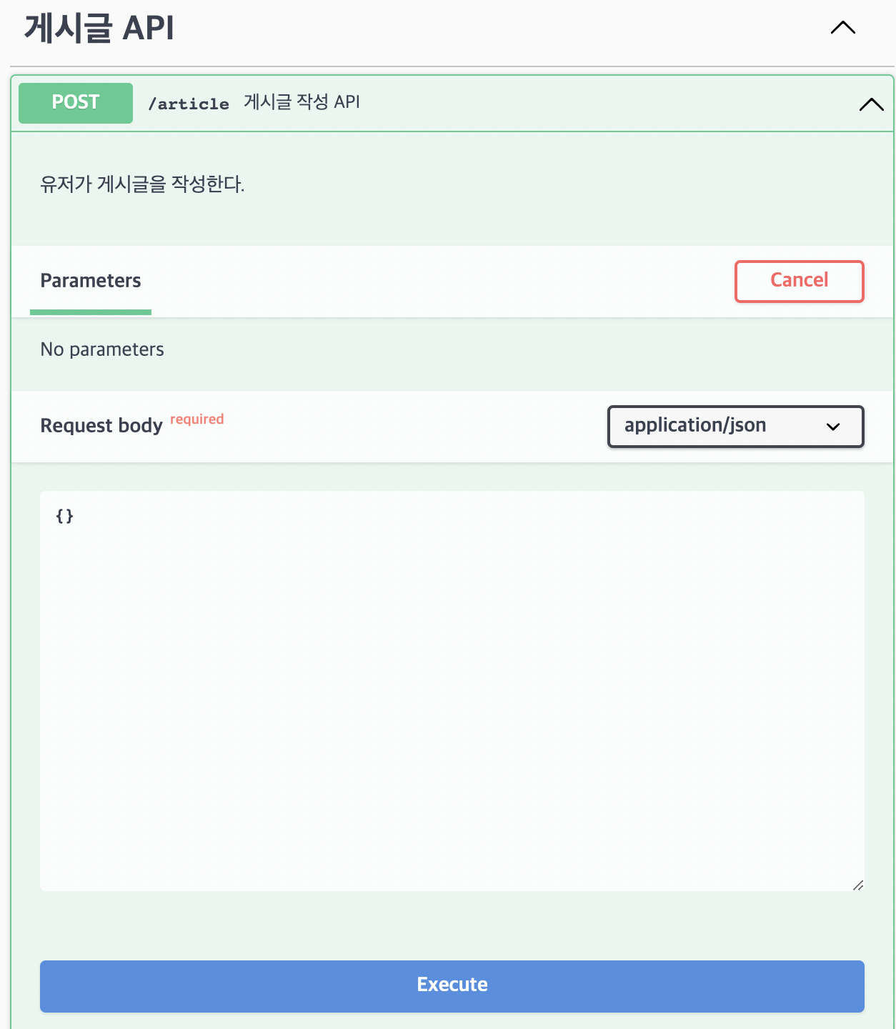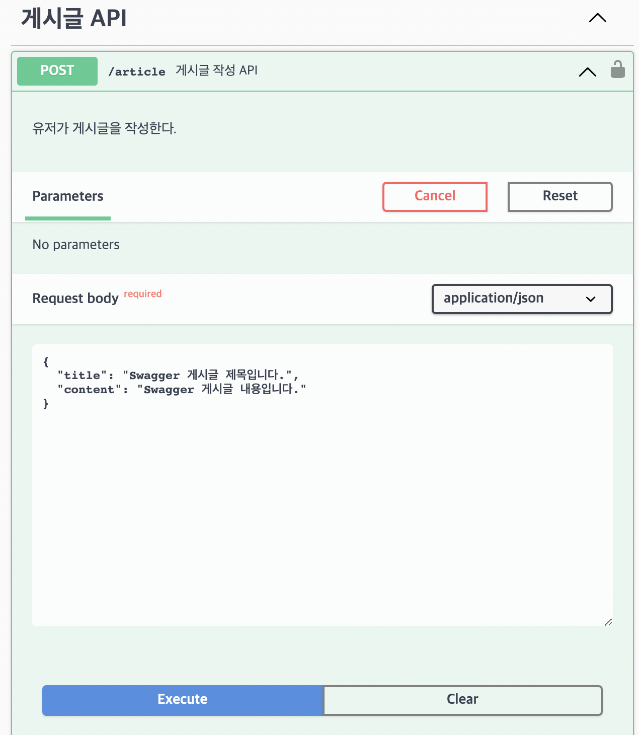 다음과 같이 게시글 작성 API의 body를 설정하고 Execute 버튼을 누르면