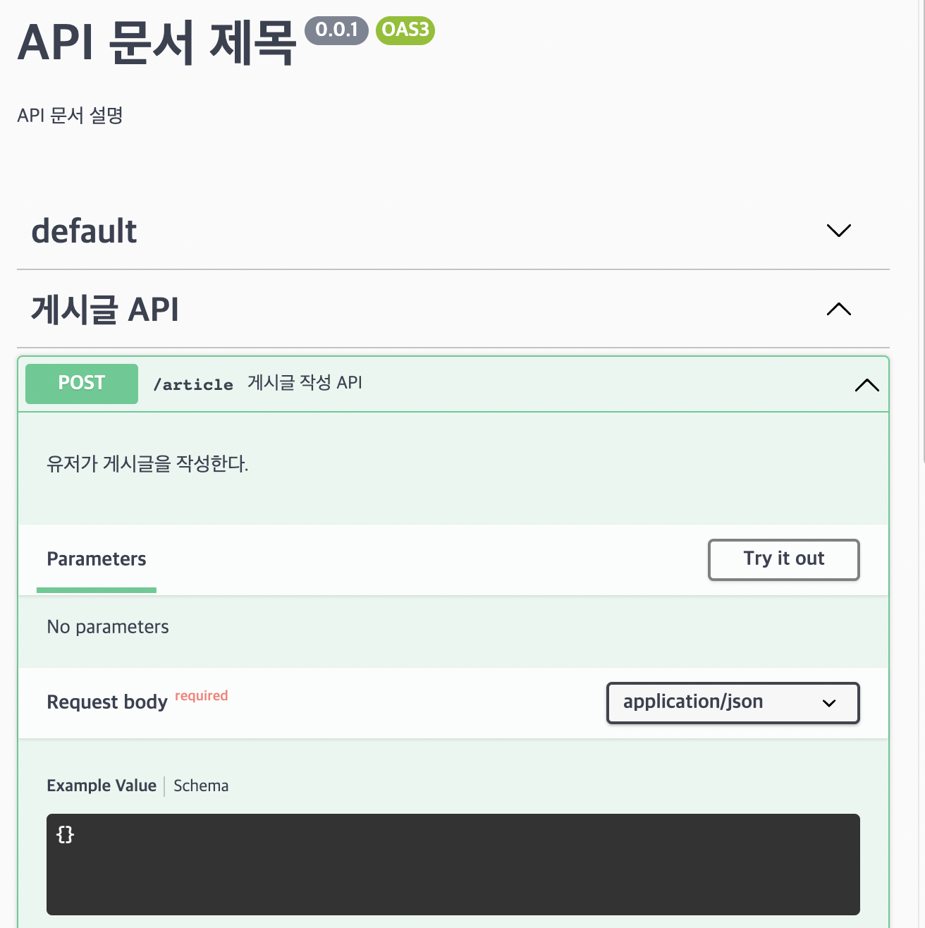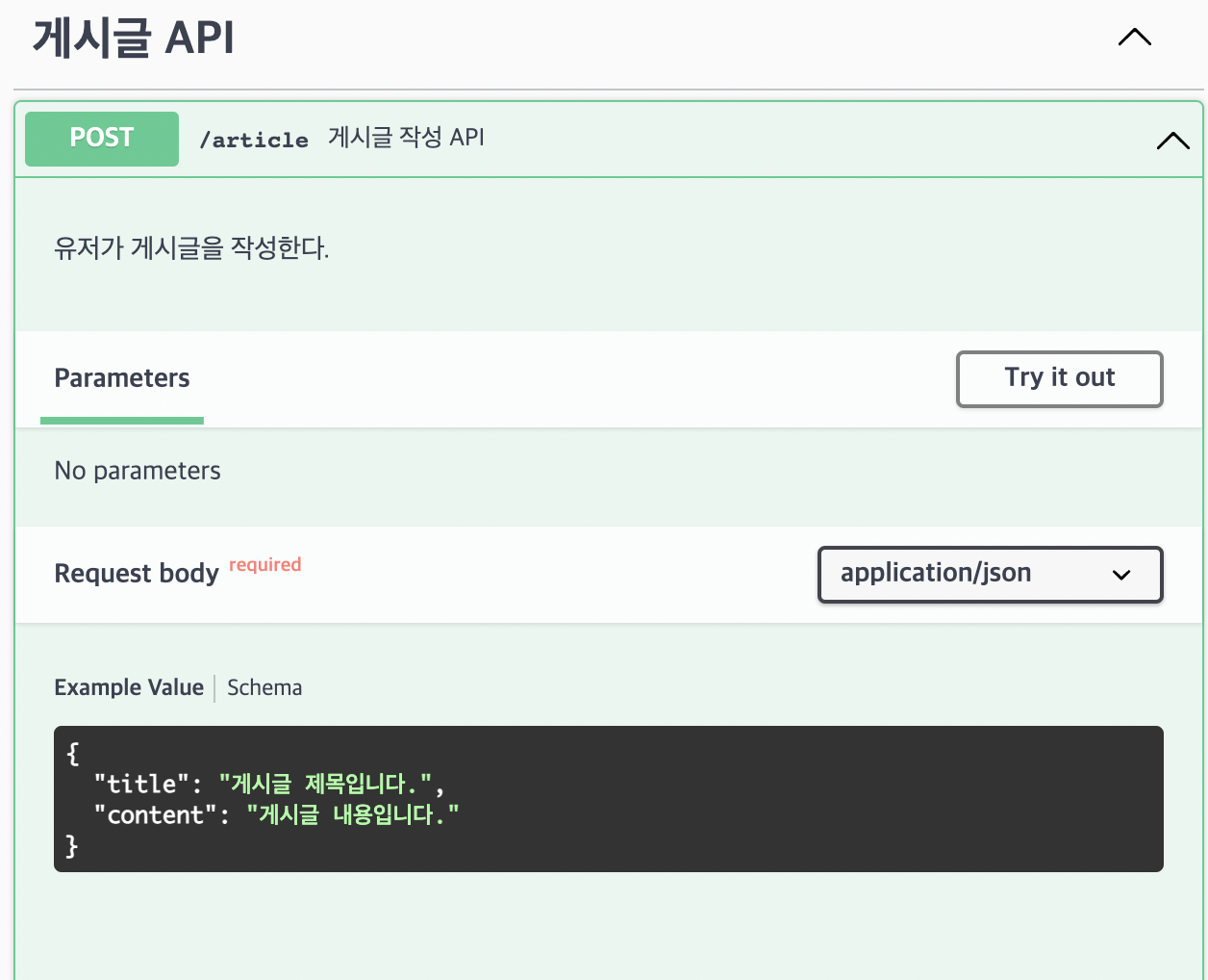 이렇게 "게시글 API" 라는 태그가 생긴 것을 볼 수 있고, 그 하위 항목들에 article관련 api들이 있는 것을 볼 수 있습니다.