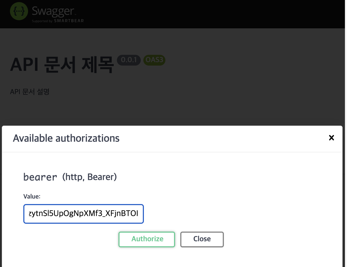 그리고 맨 위에 Authorize 아이콘을 클릭하고, value 부분에 해당 토큰을 붙여넣기 합니다.