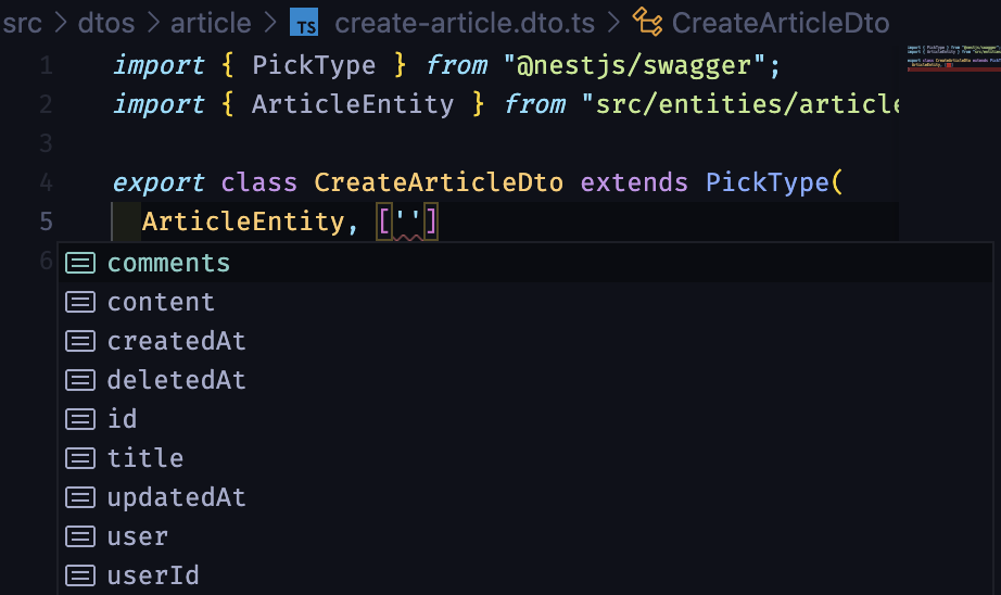 CreateArticleDto extends PickType : 그 클래스의 이름은 CreateArticleDto이고, PickType을 상속받고 있어