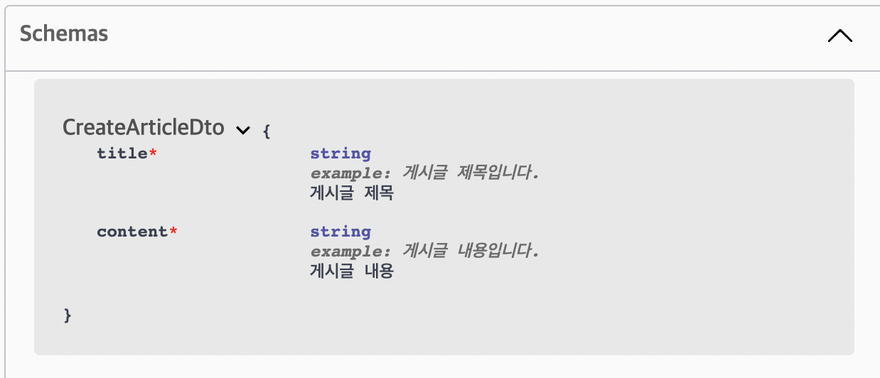 Schema에 CreateArticleDto에 대한 설명이 적용되는 것을 볼 수 있습니다.